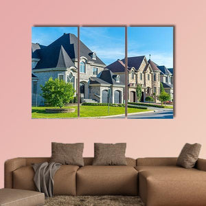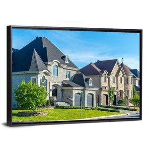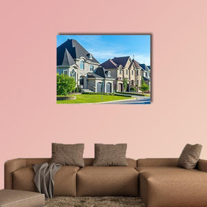 A landscape canvas showing a luxury house on a quiet Montreal street, with stone facades, dark roofs, green lawns and trees beneath a sunny blue sky. The eye-level view and blue-green, gray and tan palette create a peaceful, affluent mood that works well in modern living rooms and shared spaces.