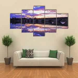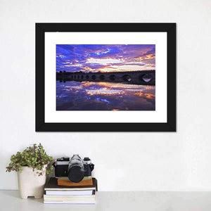 This landscape canvas captures the Marco Polo Bridge in Beijing, showing the stone arches mirrored in calm water beneath vibrant sunset clouds. A palette of blue, orange, purple and white creates a serene yet dramatic mood that fits modern home decor.