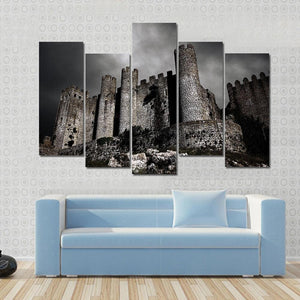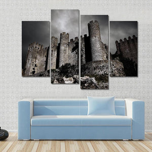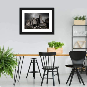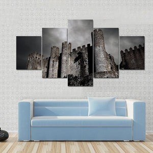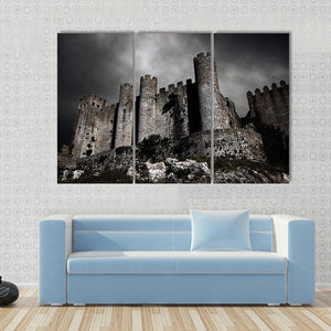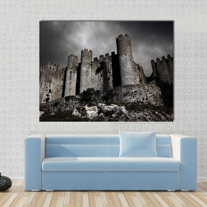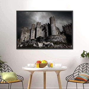 This canvas art depicts a stone castle under a dark sky, capturing a foreboding and dramatic atmosphere. The low angle perspective emphasizes the castle’s towers and stone battlements, making it a striking addition to any wall display.