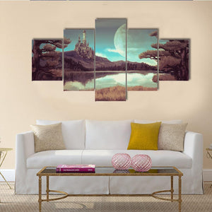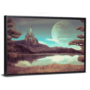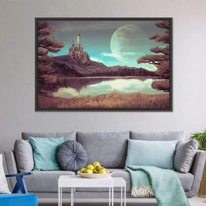 A fantasy landscape that centers on a medieval castle on a hill beside a calm lake under a large pale moon, with tall evergreen trees and distant mountains. Painted in blue, purple, green and brown tones and composed using the rule of thirds and layered depth, it creates an enchanting, serene, mysterious atmosphere that suits modern or nature-themed interiors.
