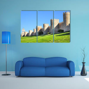 This captivating landscape portrays the ancient stone walls and towers of Avila, set against serene green hills under a clear blue sky. The realistic portrayal invites a sense of history and grandeur, making it a beautiful addition to any wall.
