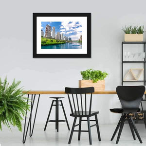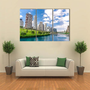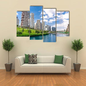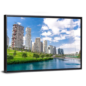 La Mexicana Park canvas depicts a wide-angle cityscape of a riverside park with a fountain, modern buildings, and a daytime sky. Cool blues, greens, whites, and grays set a calm, urban-tranquility mood; the scene includes buildings under construction and works well in modern homes or office spaces as room decor.