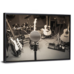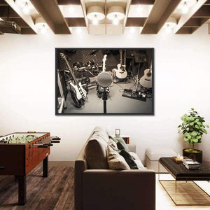 Musical instruments and a studio microphone appear in a vintage, sepia-toned scene that reads creative and professional. The medium, eye-level composition places a studio microphone in the foreground with guitars, drums, and acoustic treatment visible behind it. Fits nicely in a home studio, music room, or modern living space.