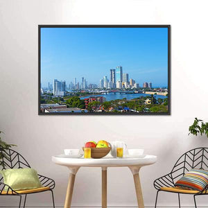 Modern Development In Cartagena shows a bright, sunny waterfront cityscape with skyscrapers, a bridge and tropical foliage in the foreground. The wide-shot composition uses blue, green, white and grey tones to convey a bustling daytime atmosphere. It suits modern interiors and room decor.