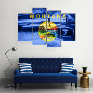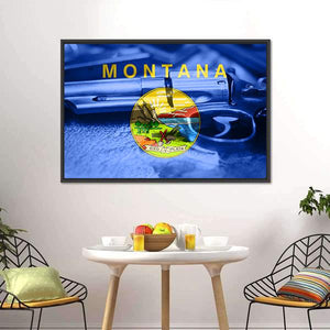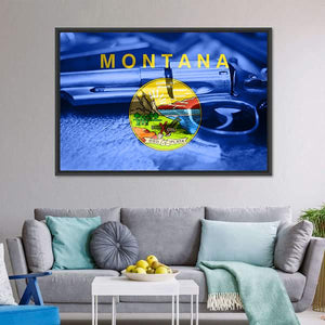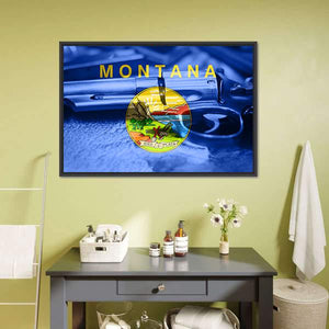 This canvas art features the Montana flag, prominently displaying the state name and seal. With a palette of blue, yellow, green, and brown, it evokes a sense of pride and patriotism, making it a meaningful addition to your decor.