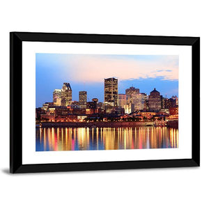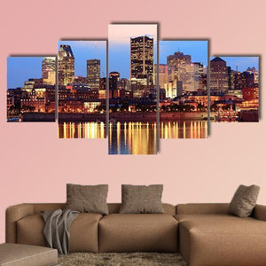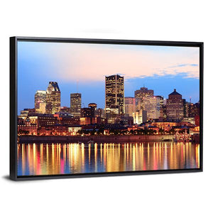 This photorealistic canvas shows the Montreal skyline over a waterfront, with buildings and evening lights reflecting in the river. The blue, pink, orange and yellow palette creates a vibrant yet serene urban atmosphere, suited to modern living rooms and other contemporary spaces.