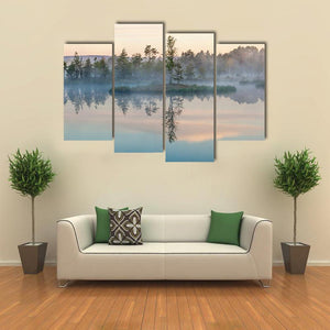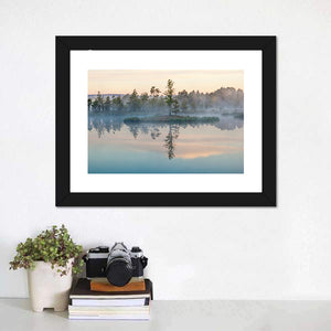 A misty lake scene featuring a lone tree on a small island, forested shore, and soft water reflections that set a calm, peaceful mood. Rendered realistically in blue, green, brown and pink tones, it fits well in modern living rooms or bedrooms as understated room decor.