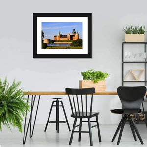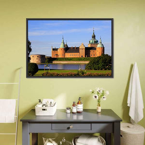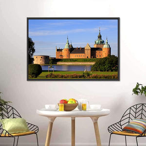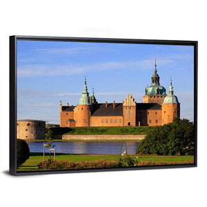 Kalmar Castle In Sweden Canvas Art shows a historic castle beside calm water, framed by trees under a broad sky. The scene reads majestic and serene, with warm oranges balanced by cool blues and greens. It suits modern or nature-inspired interiors as a quiet focal piece.