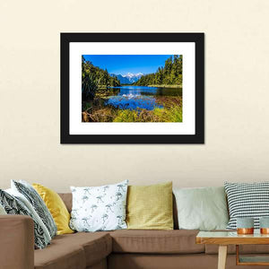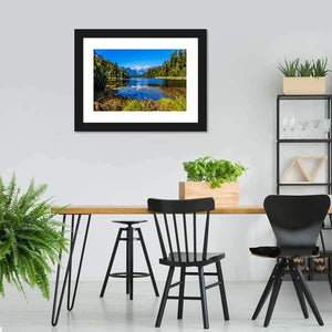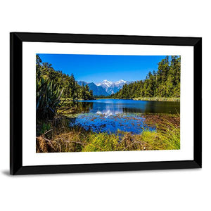 Mount Cook From Lake features snow-capped peaks reflected in a clear blue lake, framed by lush trees and shoreline grass. The photorealistic scene reads peaceful and bright, with vivid blues and greens that add depth to a room. It suits modern home wall decor, especially living spaces that favor calm, nature-focused art.