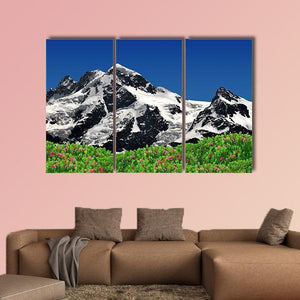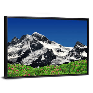 Breithorn appears as a realistic landscape print: snow-capped mountains rise above a green field dotted with small pink blossoms beneath a clear blue sky. The rule-of-thirds composition and a serene, majestic, vibrant palette of blue, white, green and pink make this piece well suited to modern living rooms or bedrooms.
