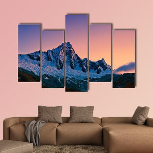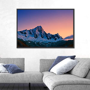 Snow-capped mountains and a glacier sit beneath a colorful gradient sky in this realistic landscape print. The scene uses depth and a rule-of-thirds composition to create a serene, majestic mood. It pairs well with modern homes and room decor that favor nature-inspired art.