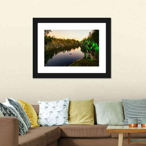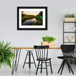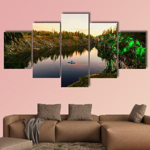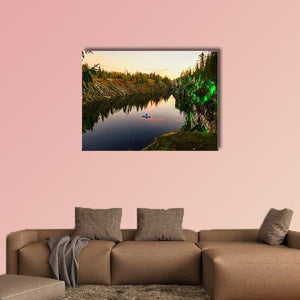 This realistic landscape shows a river framed by cliffs and trees, with a blue kayak on the water and a green-illuminated cliff face reflected in the surface. The scene has a serene, atmospheric, autumn-leaning palette of green, blue, orange, and brown, a quiet choice for modern living rooms, bedrooms, or nature-focused wall decor.