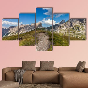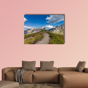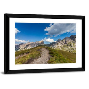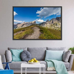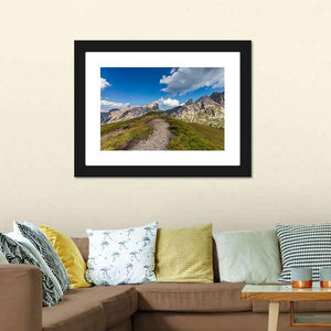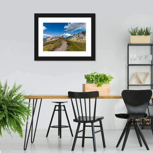 A photographic landscape of a gravel path cutting through grassy hills toward jagged mountain peaks under puffy white clouds. The scene reads adventurous yet serene, using a green, blue, grey and white palette to convey open, daytime skies and distance. Suited to modern home interiors that favor natural, expansive views.
