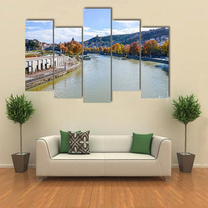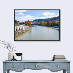 River In Tbilisi presents a realistic riverside scene with buildings, trees, autumn foliage and a small boat under a cloudy sky. The wide-angle landscape in blue, green, orange and brown tones creates a peaceful, scenic mood. This piece suits modern living rooms or entryways that favor calm, natural imagery.