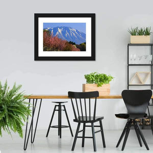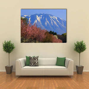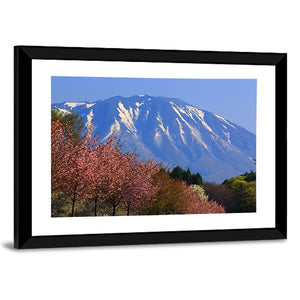 A wide, layered landscape of a snow-capped mountain and cherry blossom trees, rendered in blues, whites, pinks, greens and browns. The scene feels serene and vibrantly scenic, with patches of snow on the slopes and varying shades of pink and white blossoms. Works well in modern living spaces or rooms that favor nature-focused wall decor.