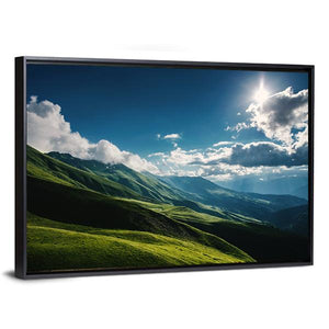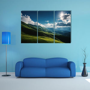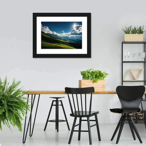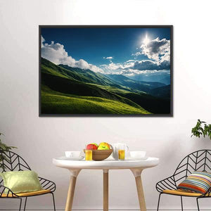 Green Mountain Canvas Wall Art depicts rolling green hills and a distant mountain vista beneath sunlit clouds. The photorealistic scene feels serene and majestic, with sunbeams breaking through clouds and lush green grass creating a bright, airy mood. It pairs well with modern room decor as a calming landscape element.