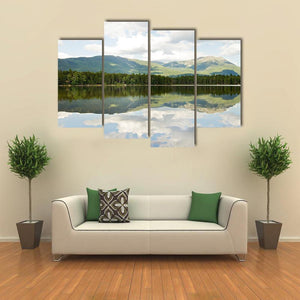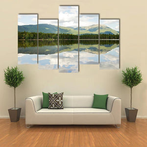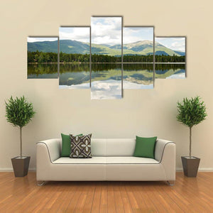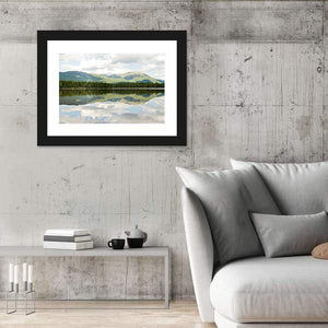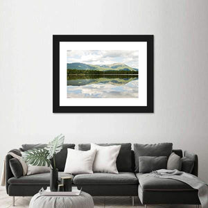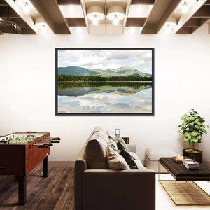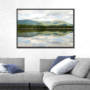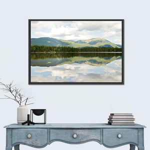 This landscape artwork beautifully captures the serene Mt Katahdin framed by a tranquil lake. The realistic depiction features lush greenery, soft blues, and soothing greys, evoking a calm atmosphere that complements any living space.