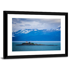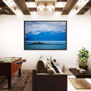 Mud Bay in Alaska depicts a realistic landscape: a lighthouse and small buildings on an island, mountains beyond and clouds over the ocean in cool blues, whites, greens, and grays. Composed with the rule of thirds, the scene feels serene, dramatic, and vast—well suited to coastal or nature-themed rooms and modern decor.