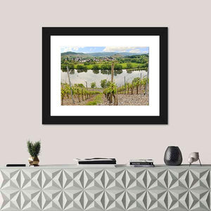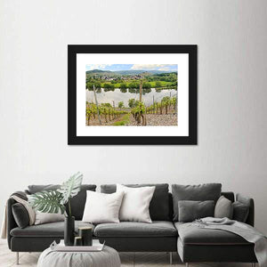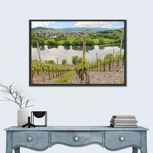 Mulheim Village & River Canvas Wall Art depicts a peaceful riverside landscape where young vineyard rows lead to a river and a distant village among green hills. Rendered in a realistic, scenic style with greens, blues, browns and whites, it suits modern or nature-inspired interiors seeking a calm, picturesque focal piece.