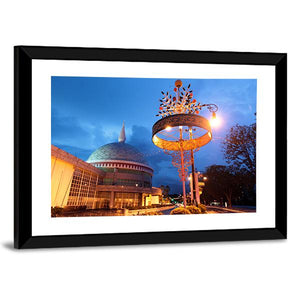 The Museum Of Insignia Canvas Wall Art captures a serene urban scene at dusk. Featuring a modern building and an ornate street lamp, this artwork reflects a majestic evening mood that brings a beautiful touch to your décor.