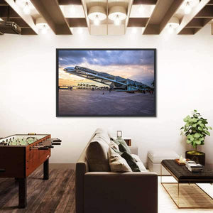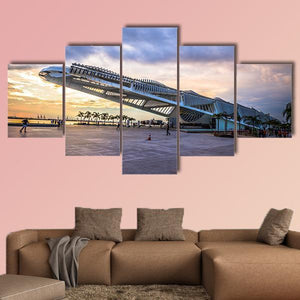 This canvas captures the Museum of Tomorrow on a waterfront at sunset, shown from a wide-angle, low perspective with people in the scene. Bold blues, warm oranges and soft greys create a dramatic yet serene mood that suits modern, architectural interiors.
