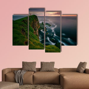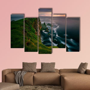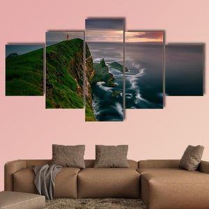 This canvas captures coastal cliffs and ocean waves at sunset, with a solitary figure standing on a cliff edge to suggest scale and quiet drama. The modern, rule-of-thirds composition uses green, blue, orange, and gray to create a serene yet awe-inspiring atmosphere. Suits modern living rooms, entryways, or bedrooms as a contemplative focal point.