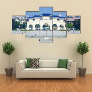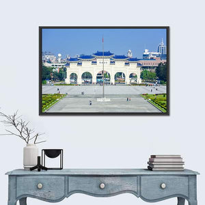 This canvas showcases the grand Chiang Kai-shek Memorial Hall in Taipei, capturing the majestic archway and bustling plaza beneath a clear sky. With its beautiful palette of blue, gray, and green tones, this artwork evokes a sense of public monumentality.