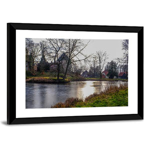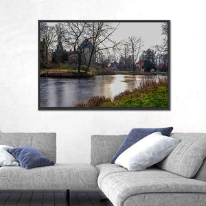 Natural Stream Germany Canvas Wall Art presents a peaceful, wintry landscape: a frozen lake bordered by bare trees and houses, with sunlight reflecting on the ice and grass and reeds along the shore. The realistic, rustic scene in blues, greens, browns, and grays works well with quiet living rooms or rustic and modern room decor.