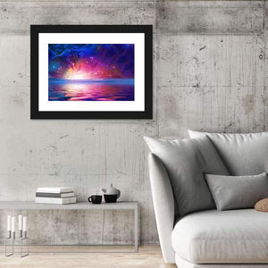 Nebula Over Alien Planet Canvas depicts a swirling galaxy mirrored in rippling water, rendered in blues, purples, pinks and touches of orange and white. The abstract scene feels surreal, vibrant and awe-inspiring. It suits modern home and room decor, especially contemporary living spaces.