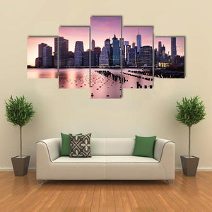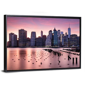 A photorealistic canvas of the New York city skyline with tall buildings, wooden pilings, and calm water under a pink and blue sky at dusk. The rule-of-thirds composition and soft palette of pink, blue, gray, purple and brown create a serene, tranquil mood. Suits modern home décor and living spaces that favor understated, calming wall art.