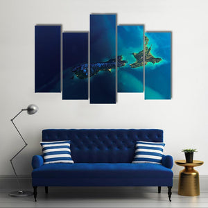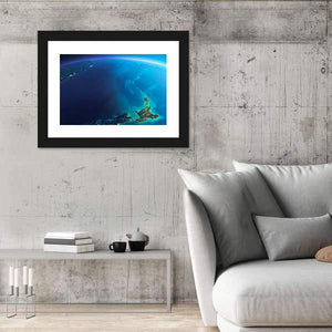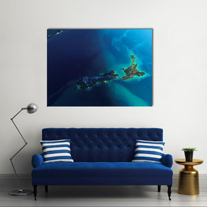 This canvas artwork features a stunning aerial view of New Zealand at night, showcasing islands and the ocean illuminated by city lights. The serene blues and greens create an awe-inspiring atmosphere for any space.