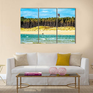 A photorealistic beach scene featuring a kitesurfer riding the blue ocean beside grassy dunes and a dense pine forest. The bright, breezy composition—rendered in blue, green, yellow, brown and black—has an active, summer feel and fits modern coastal or nature-inspired rooms.