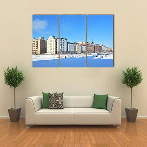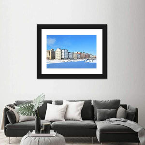 This landscape artwork captures a serene winter scene in Finland, featuring charming buildings and a frozen body of water. The calm palette of blues, whites, and greys evokes a peaceful atmosphere, making it a lovely addition to any room.