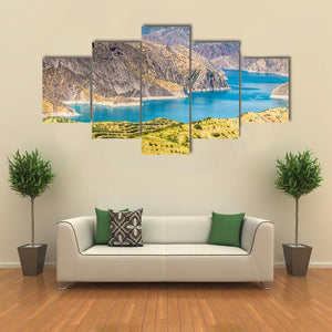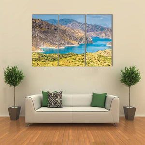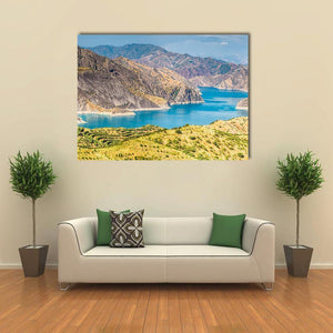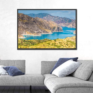 Nurek Reservoir in Tajikistan captures a photorealistic mountain lake set among terraced hills and rocky peaks. A high-angle perspective gives clear depth — you can see ripples on the water and pockets of greenery on the tan and brown slopes, creating a serene, majestic, slightly arid mood. Works well in modern living rooms and nature-themed spaces.