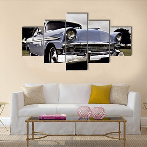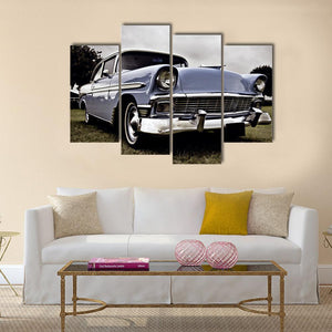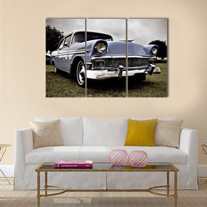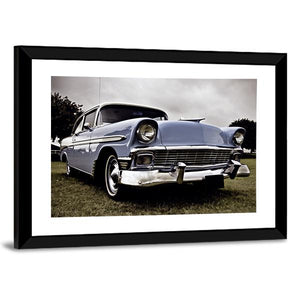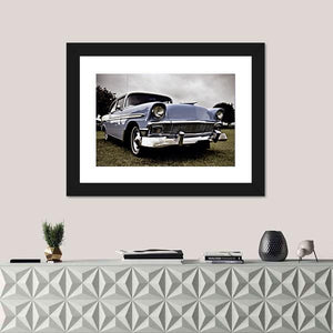 This close-up, low-angle view of an Old American car puts the chrome grille and round headlights front and center against a hint of grass. Blue, green and chrome tones create a nostalgic, classic and powerful vintage mood. A straightforward choice for home wall decor, it works well in living rooms or entryways.
