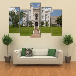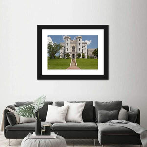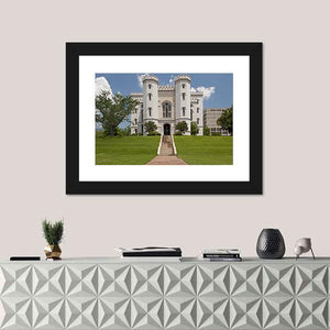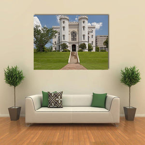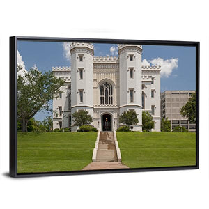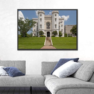 This captivating canvas art features the Louisiana Capitol Building, showcasing its majestic white towers and arched windows surrounded by a serene landscape of green lawns and trees under a bright blue sky. Its realistic style adds a historic touch, making it a perfect addition to your home decor.