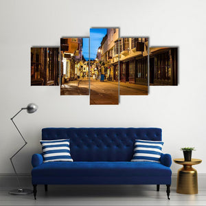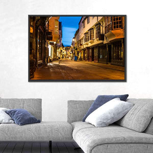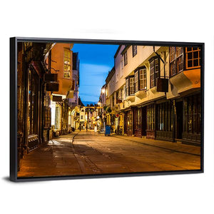 This canvas art features a captivating cityscape of a street in York, showcasing charming buildings and glowing shop windows. The evening atmosphere, highlighted by a palette of blue, yellow, and orange, adds warmth and character to your decor.