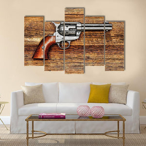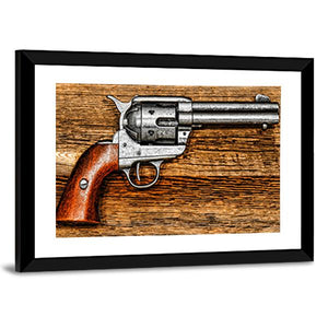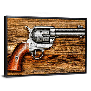 This canvas features a close-up of a vintage revolver against a backdrop of wood grain. The warm browns and greys evoke a rustic and historical atmosphere, making it a great addition to any wall decor.