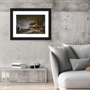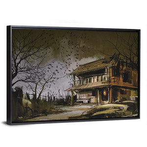 This haunting piece features an old wooden house set against a backdrop of bare trees and a flock of birds in flight. The moody atmosphere is enhanced by dark clouds and a glowing window, making it an evocative addition to your decor.