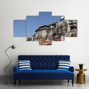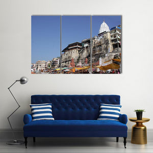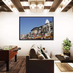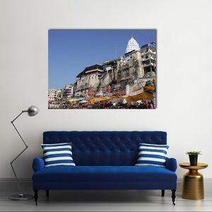 This canvas art showcases the vibrant Omkareshwar Jyothiling Temple complex, set against a bustling riverfront market. The rich palette of blue, ochre, and red captures the historic essence of this Indian landscape.