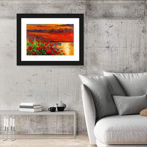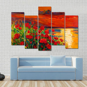 This vibrant canvas art depicts a serene field of poppies under a beautiful sunset sky with reflections on water. Its impressionistic style adds a painterly touch, making it a captivating focal point for any space.