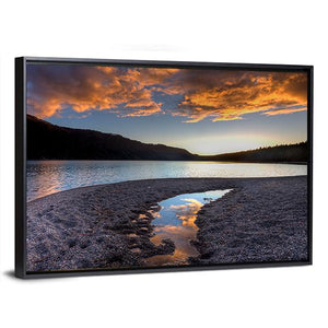 Pend Oreille Lake Canvas Wall Art shows a calm lakeside at sunset, with mountains and clouds mirrored on the water and a pebbly shore in the foreground. Rendered in a realistic style with blue, orange, brown and gray tones, it brings a tranquil, peaceful mood that suits modern or nature-inspired rooms.