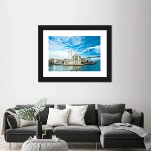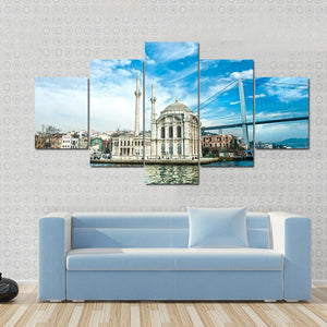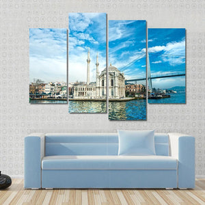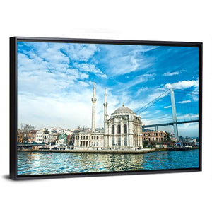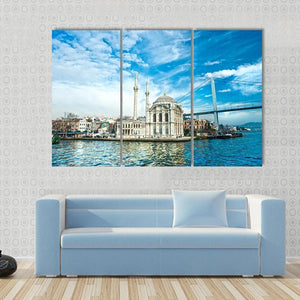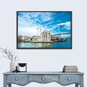This canvas captures the grandeur of the Ortakoy Mosque set against a serene waterfront, with a suspension bridge in the background. The blue and white palette adds a calm touch to any space.