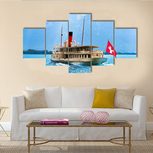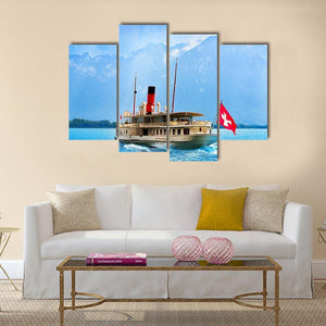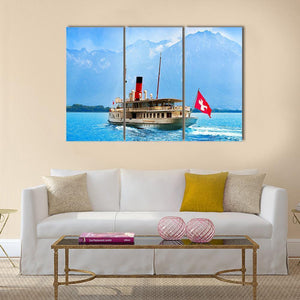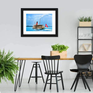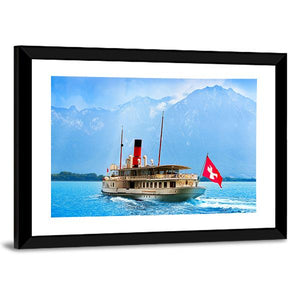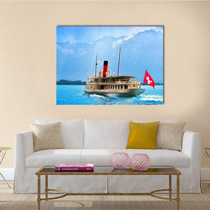 A realistic canvas showing a paddle steamer on Geneva Lake, set against calm water and distant mountains for a serene, picturesque travel scene. Notable details — a white hull with green accents, a red-and-black smokestack and a Swiss flag — make this print a good fit for lakeside homes and modern living rooms.