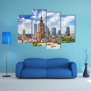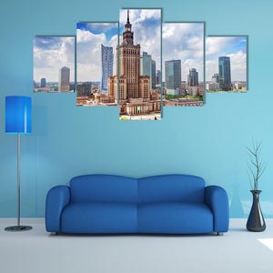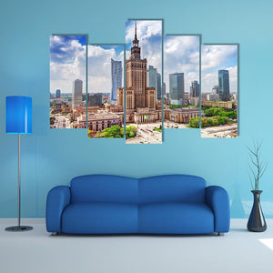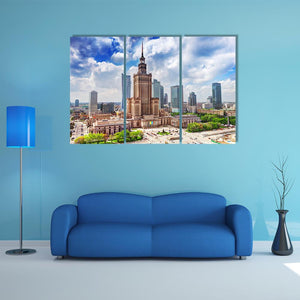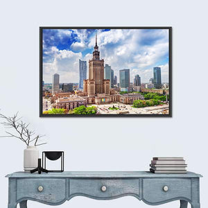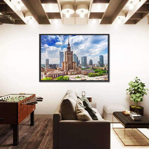 This canvas art captures the Palace of Culture and Science in Warsaw, showcasing its magnificent skyline and modern architecture. The bright blue and white palette, complemented by hints of tan and green, reflects an urban and busy atmosphere.