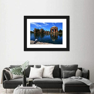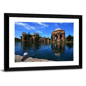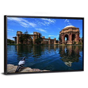 A photographic canvas of a domed palace beside calm water, with its reflection and a pigeon at the water’s edge. The rule-of-thirds composition and a blue, orange, brown and white palette give the scene a peaceful, serene mood. Suits modern living rooms or entryways as a quiet focal piece.