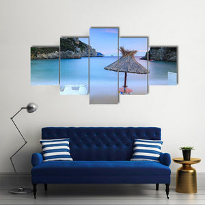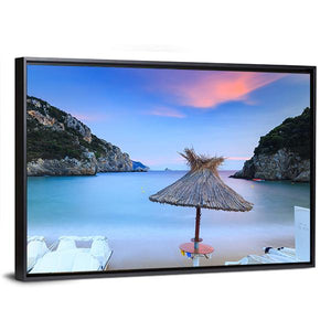 A photo-realistic beach scene that shows a straw umbrella, calm ocean, nearby hills and pedal boats beneath a colorful sunset sky. The peaceful, serene palette of blue, pink, tan and green creates a tranquil atmosphere that works well in coastal or modern room decor.
