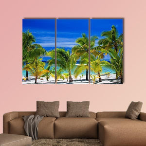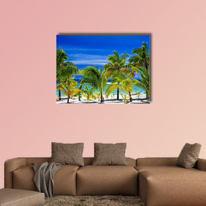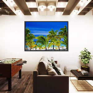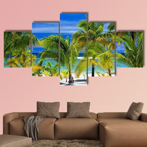 This photorealistic canvas captures a tropical beach scene with palm trees, a hammock strung between two palms, and the calm ocean. A blue, green, white and yellow palette and a rule-of-thirds composition create a relaxed, tropical mood that fits modern or coastal rooms.