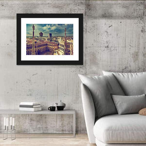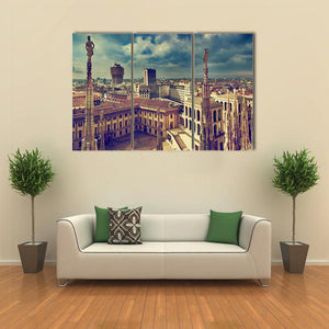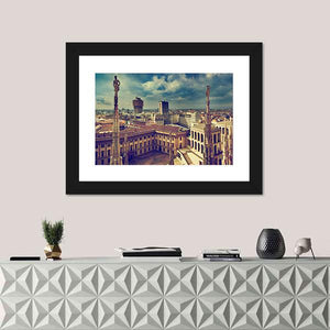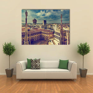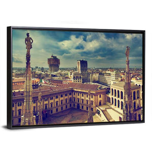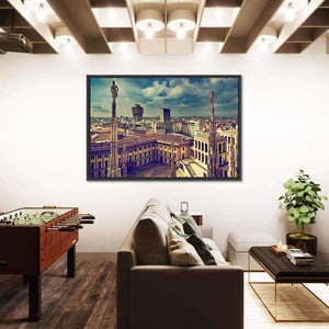 Experience the grandeur of Milan with this striking canvas art. Showcasing the city's skyline, historic architecture, and detailed statues, it evokes a dramatic and vintage atmosphere.