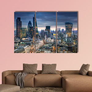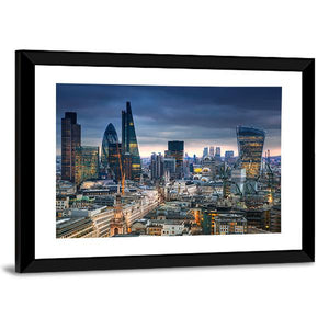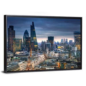 This panoramic canvas captures the City of London skyline at dusk, with tall modern skyscrapers and glowing windows. Rendered in a photorealistic style with blues, grays and warm light accents, it fits modern living rooms, home offices, or travel-themed spaces.